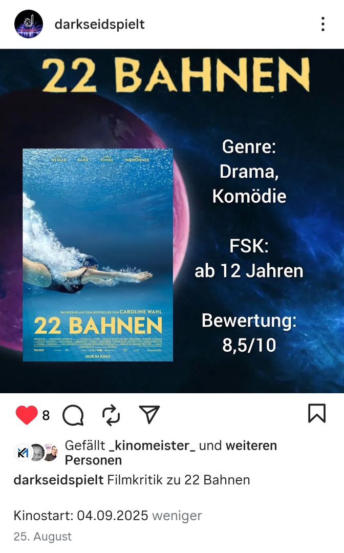 Hervorragende Unterwasseraufnahmen, ein gelungener Soundtrack und eine ehrliche Geschichte treffen in „22 Bahnen“ aufeinander. Es wird auch deutlich ausgesagt, dass ein Alkoholiker nie zugeben wird, dass er vom Alkohol abhängig ist und solange er es nicht selbst zugibt, wird es auch keinen Sinn machen, ihm zu helfen.