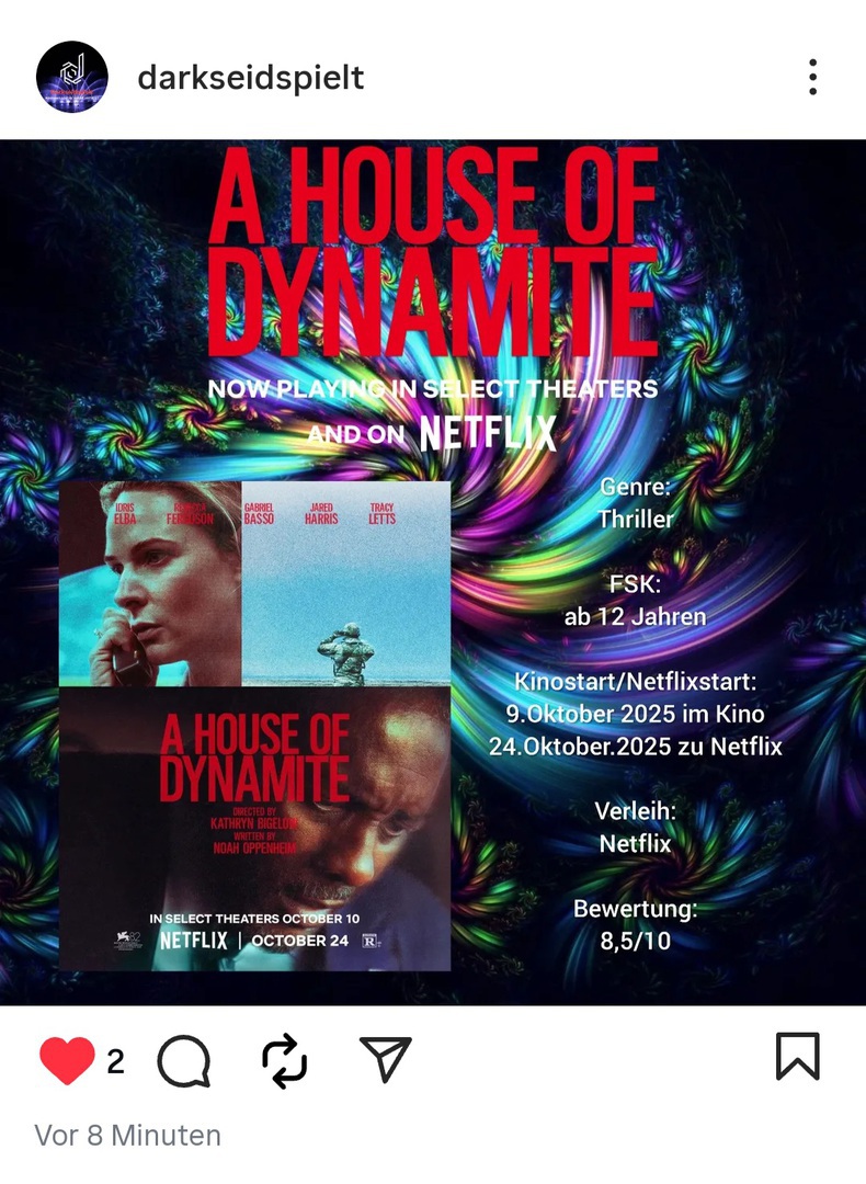 „A House of Dynamite“ ist ein Politthriller, in dem es weniger um Krieg geht. Vielmehr geht es aber um die Ängste, die in einem vorgehen und die Frage nach den quälenden Momenten zwischen dem Entdecken der Rakete und der finalen Entscheidung des Präsidenten. Eine Antwort auf die Frage nach der finalen Entscheidung des Präsidenten gibt es in dem Thriller allerdings nicht. Hier bleibt die Antwort offen und jeder kann sich nun seine eigene Antwort ausmalen… was wäre wenn?
