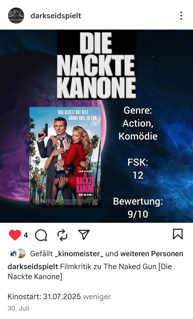 In „Die nackte Kanone“ tritt Lt. Frank Drebin Jr. in die Fußstapfen seines Vaters… Ein geglücktes Reboot der Erfolgskomödie mit Liam Neeson und Pamela Anderson in den Hauptrollen. Die beiden harmonieren perfekt miteinander und haben mindestens genauso viel Spaß, wie man es im Film zu sehen bekommt. „Die nackte Kanone“ ist eine abgedrehte Komödie, die wirklich sehr gelungen ist und die es wert ist anzuschauen!!! Keine billige Kopie, kein schlechtes Reboot. Hier passt einfach alles… Es gibt sicherlich genügend Skeptiker, denen man nur empfehlen kann, ihre Vorurteile abzulegen und selbst ein Bild von der gelungenen Neuverfilmung machen sollen. Neuverfilmung ist es auch nur bedingt, denn eigentlich könnte man die Neuverfilmung auch als Fortsetzung sehen und wer die Filme alle gesehen hat, der wird dies sicherlich genauso sehen. Wenn man ehrlich ist, so ist „Die nackte Kanone“ eine der besten Hollywood-Komödien der letzten Zeit geworden.