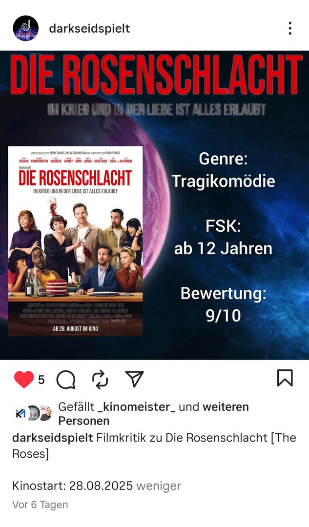 „Die Rosenschlacht“ ist die Neuinterpretation des Filmklassikers „Der Rosenkrieg“ von 1989, der auf dem gleichnamigen Roman von Warren Adler basiert… Olivia Colman und Benedict Cumberbatch sind genau richtig für die Rollen des „Bilderbuchehepaars“, die sich im Verlauf des Films so richtig auf die Nerven gehen und mit einem echten Feuerwerk (der Gefühle) überzeugen.