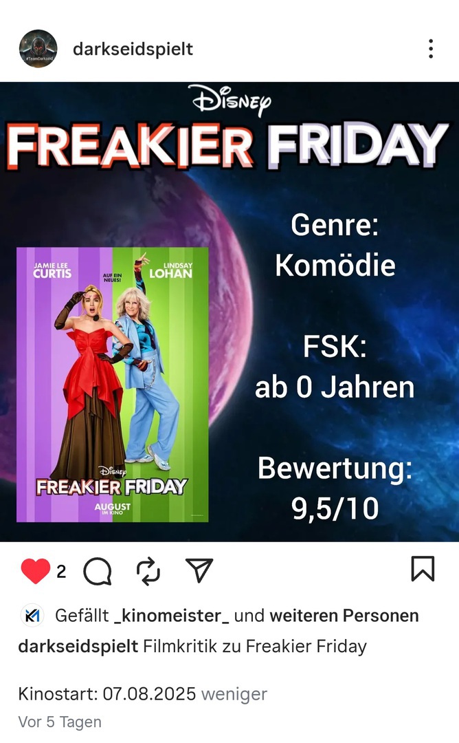 „Freakier Friday“ basiert auf dem 1972 erschienenen Buch „Freaky Friday“ von Mary Rodgers. Die Besetzung ist bestens gewählt und harmoniert bestens, besonders im zweier Gespann „Mutter und Oma“ oder „Oma und Enkelin“ liefern sie herausragende Leistungen. Der Film orientiert sich schon sehr an den Vorgängerfilmen. Wer aber diese nicht gesehen hat, wird trotzdem seinen Spaß haben.